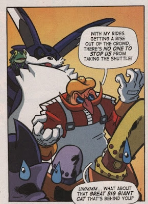 Also, Big the Cat is here for some reason. I mean that fairly literally. He's wandering around Paris without any explanation. He wanders into the action scene, recognizing Eggman. The only act he contributes to the story is punching the bad guy in the face. Granted, the cat had a chance to grab the villain then and there. Sensing a pattern, he lets the bad guy get away. I'm no fan of Big, mainly because I find his personality annoying and hate all those fucking fishing mini-games in “Sonic Adventure.” He remains that useless in his appearance here.